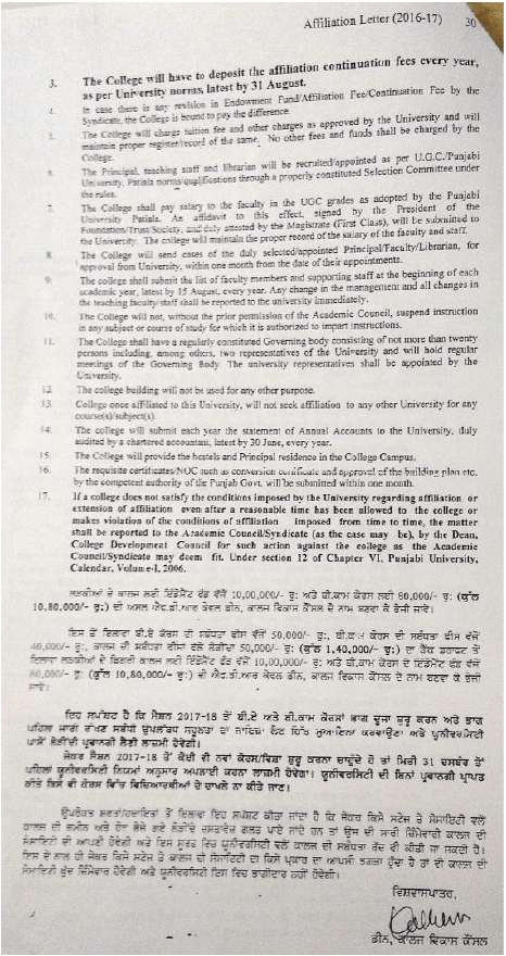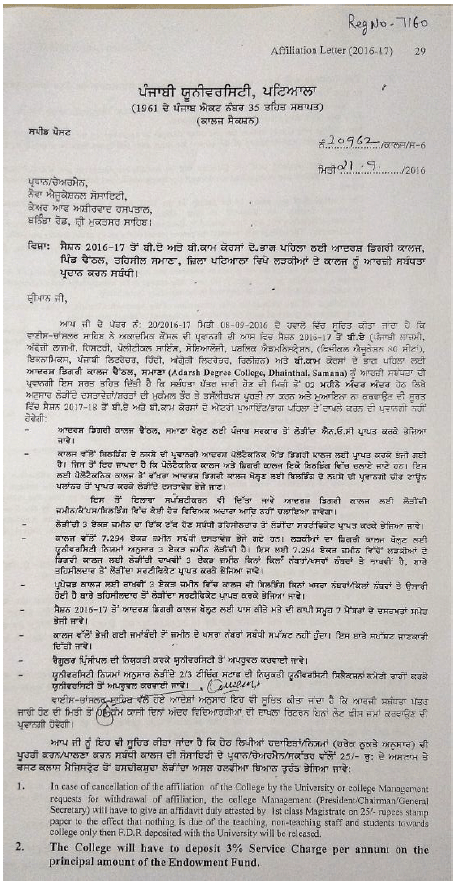 Adarsh Degree College, Village Dhainthal, Samana is affiliated to Punjabi University, Patiala vide affiliation number 20962 dated 21-09-2016.
